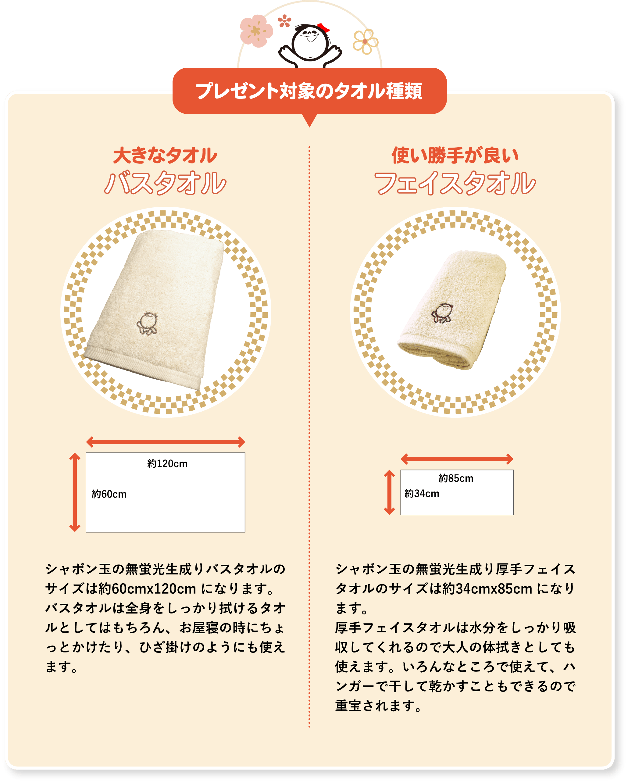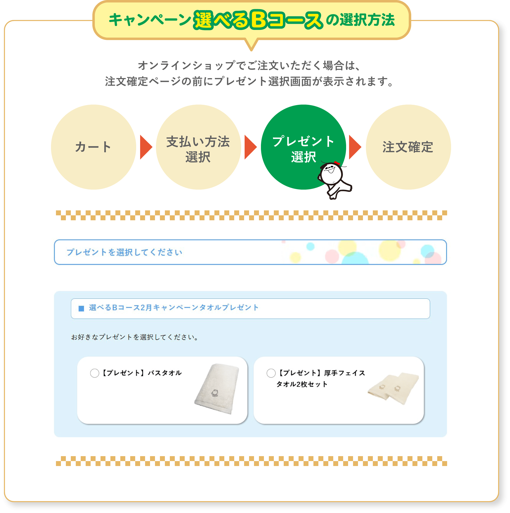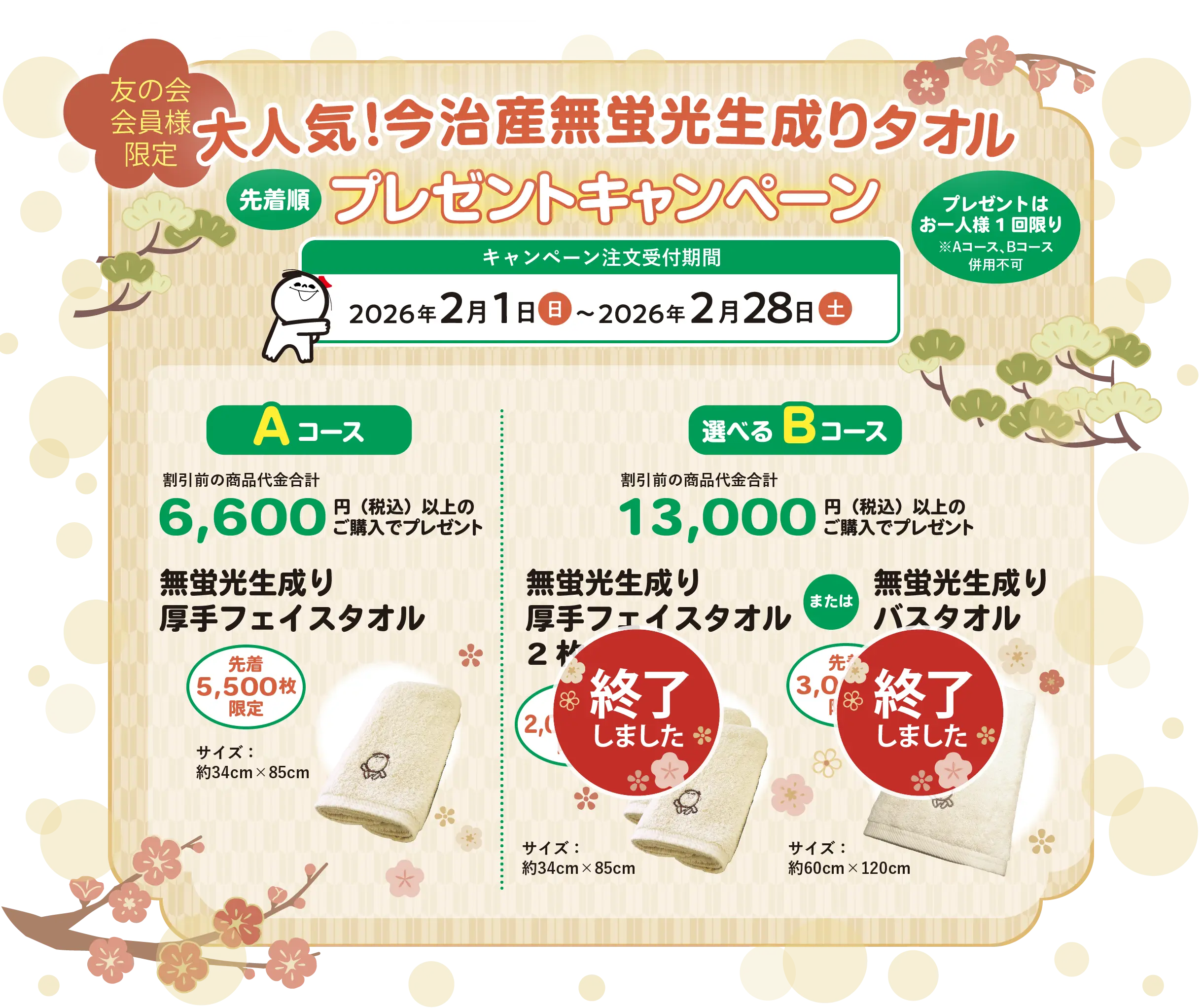 ※キャンペーンはお一人様1回限りです(Aコース、Bコース併用不可)。予定数量に達した場合、キャンペーン期間中でも終了させていただきます。※ご注文が殺到した場合、出荷が遅くなる可能性がございます。予めご了承ください。※キャンペーン開始直後はお電話が混み合うため、つながりにくくなる可能性がございます。ご理解賜りますようお願い申し上げます。※ハガキ・FAX・注文用紙でのご注文の場合、どちらのプレゼントをご希望かご記入ください。割引前の商品代金合計13,000円(税込)以上のご購入かつ、ご記入がない場合はバスタオルをお送りさせていただきます。※プレゼント品はご指定の有無に関わらず、ご注文者様へ発送させていただきます。