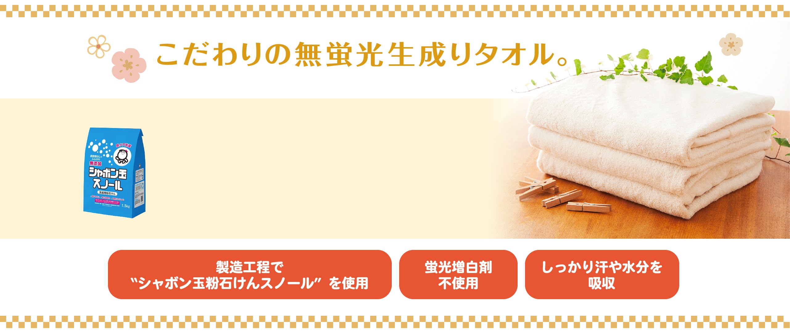 製造工程において「粉石けんスノール」を使用。一本の綿糸からタオルが出来上がるまで、化学薬品を使用せず、一般的なタオルより2~3倍の時間や手間をかけて作っています。デリケートなお肌の方やお子さまも使っていただけるこだわりの無蛍光生成りタオルです。