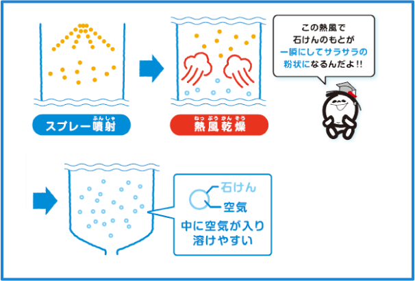 出来上がった粉の中に空気を含んだ中空粒状粉石けんは